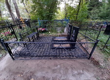 Далее мы установили памятники с цветниками, параллельно приварив необходимые для покрытия брусчаткой металлические борта к ограждению и закрыв территирию участка геотекстилем.